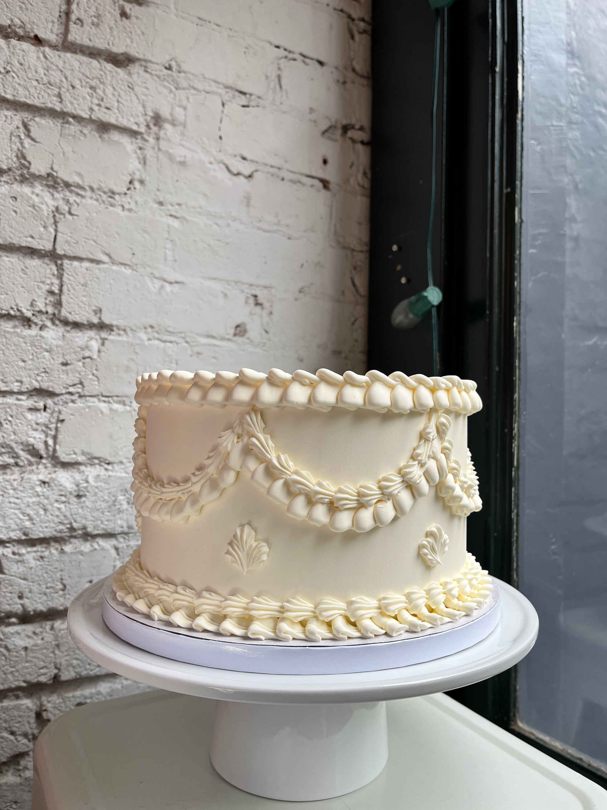 A single-tier version of our popular piped lambeth cake. All white, single color.